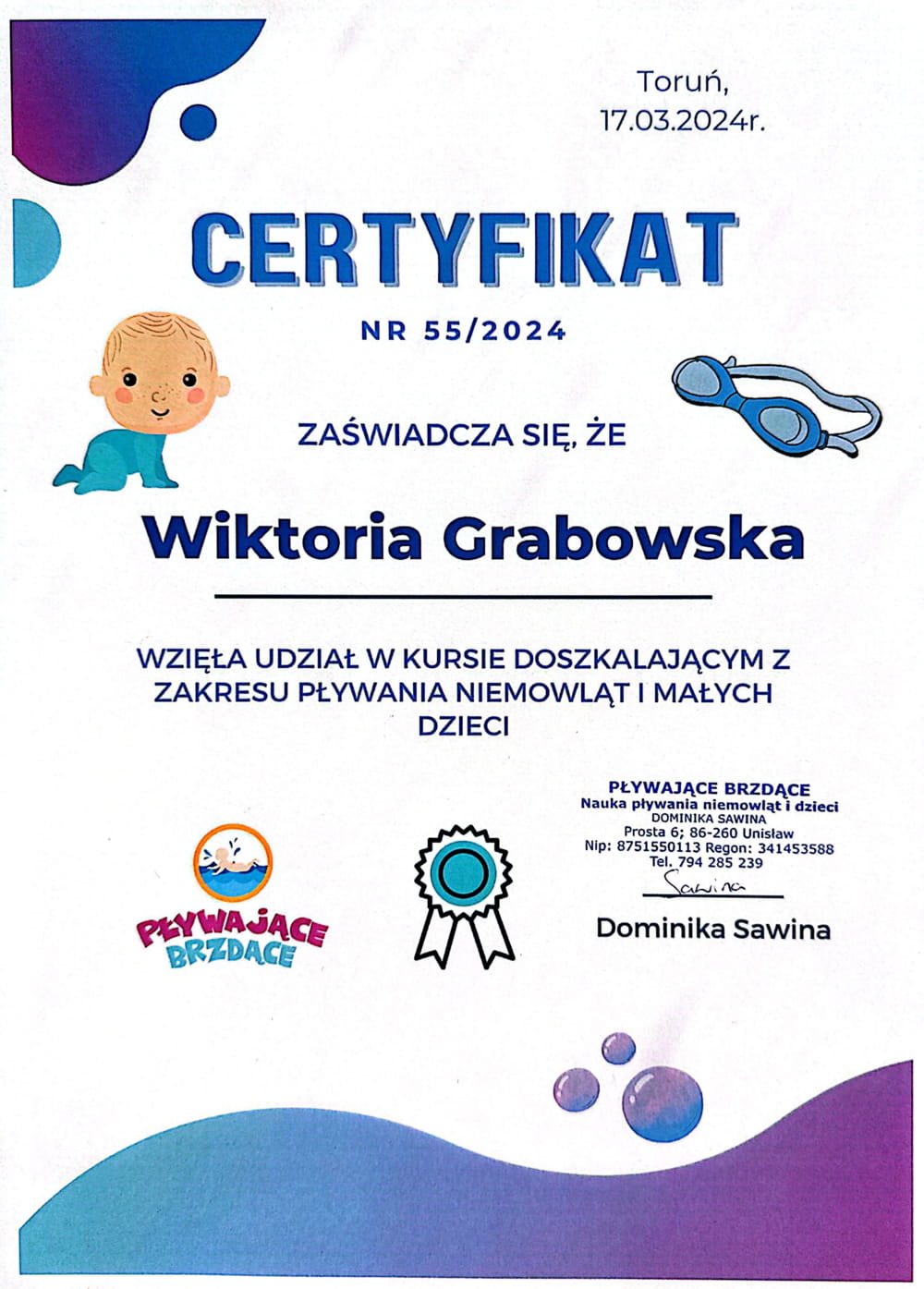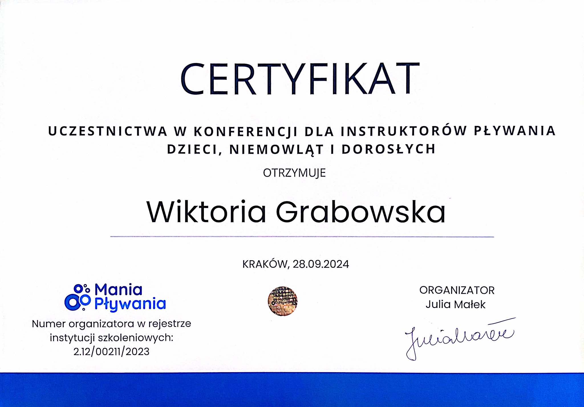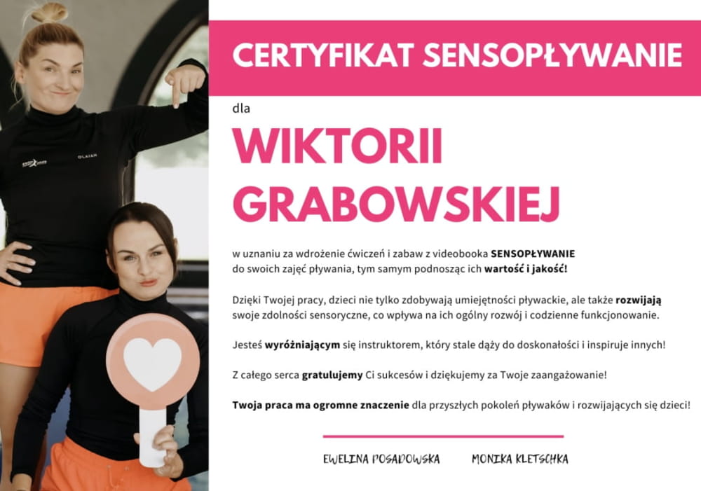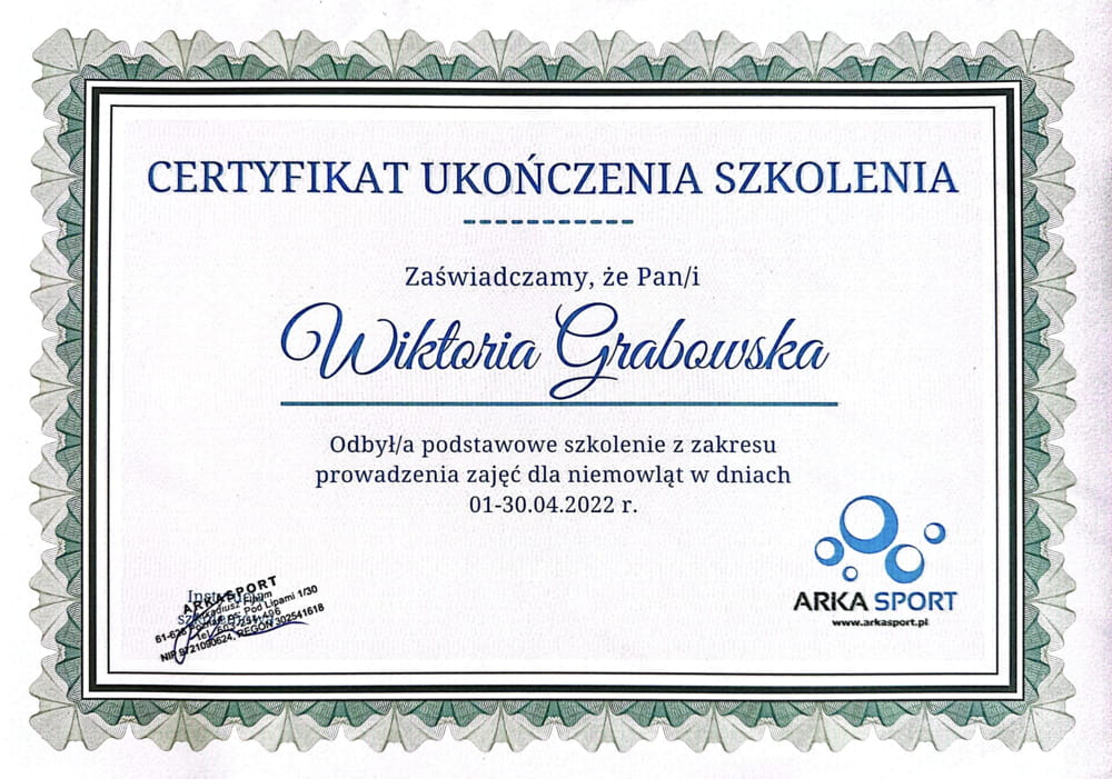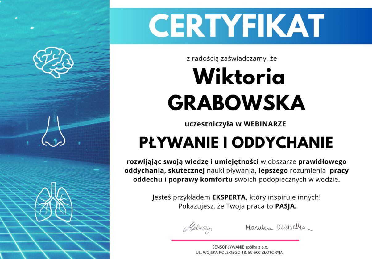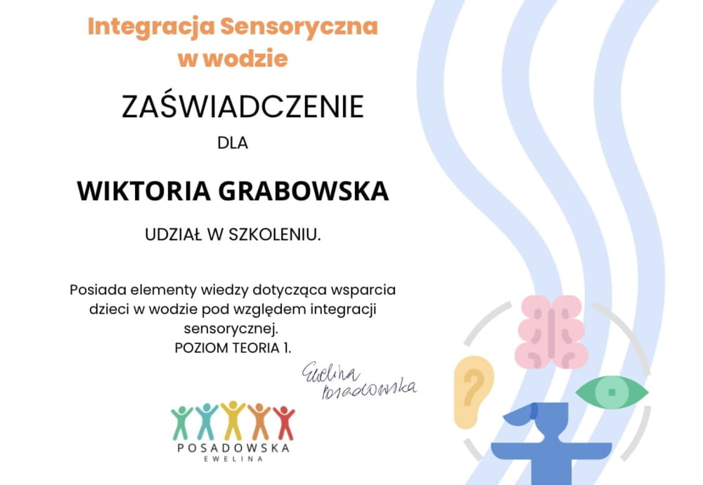 • W 2024 roku zdobyłam certyfikat uprawniający do prowadzenia terapii integracji sensorycznej w wodzie, co znacząco podniosło jakość i wartość prowadzonych przeze mnie zajęć. Nieustannie poszerzam swoją wiedzę, regularnie uczestnicząc w konferencjach oraz kończąc kolejne kursy i szkolenia.