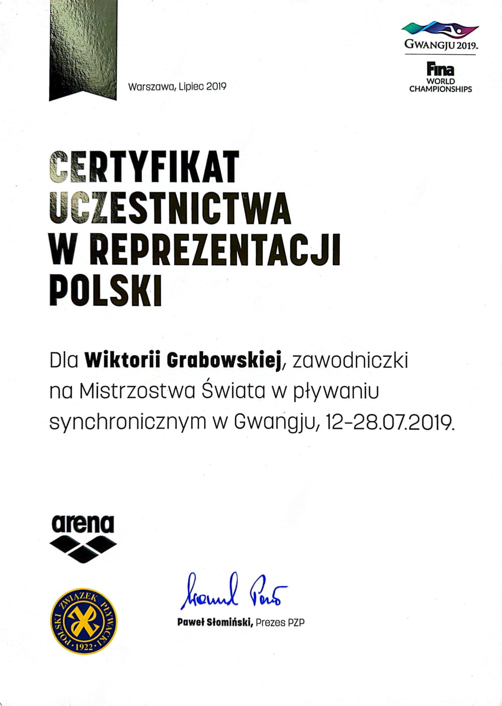 • W 2019 roku wzięłam udział w Mistrzostwach Świata w Korei Południowej w Gwangju, co było przełomowym momentem w historii polskiego pływania artystycznego. Jako jedyna solistka reprezentowałam Polskę w kategorii solo techniczne, co było dla mnie ogromnym wyróżnieniem. Były to moje ostatnie zawody, jednocześnie zwieńczające moje największe marzenie o starcie na imprezie tej rangi.