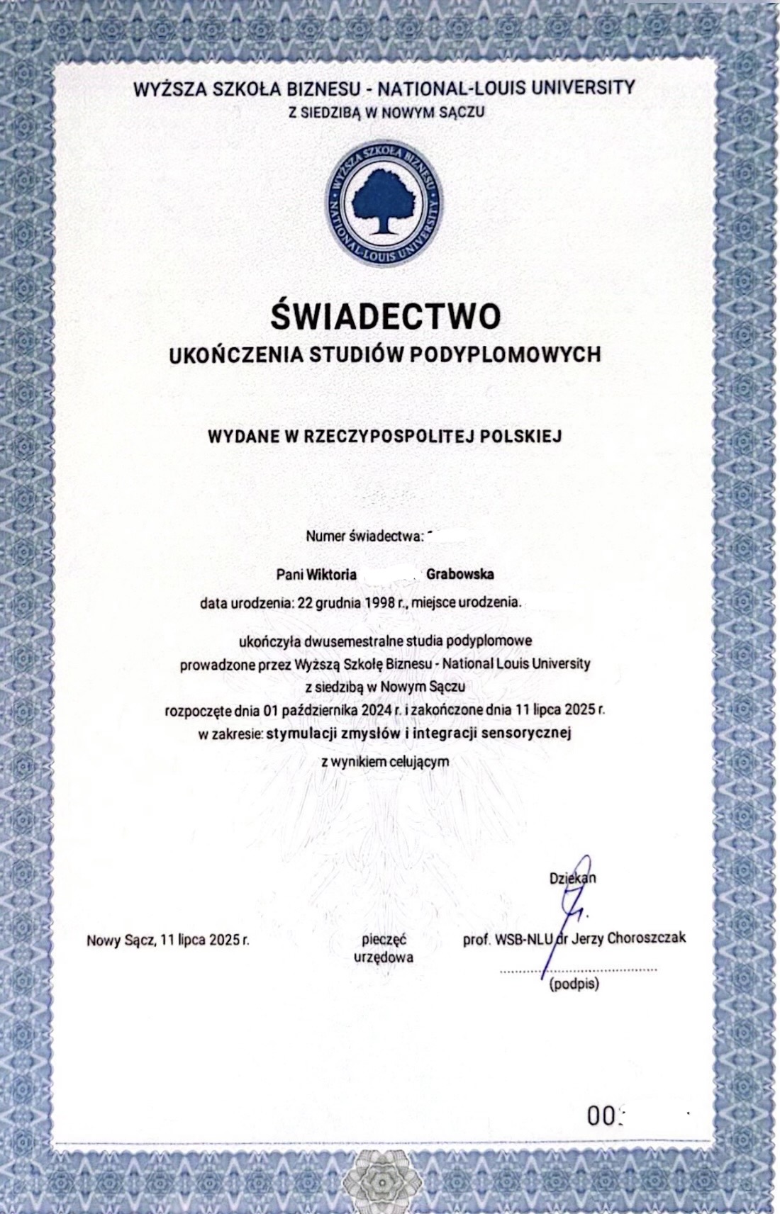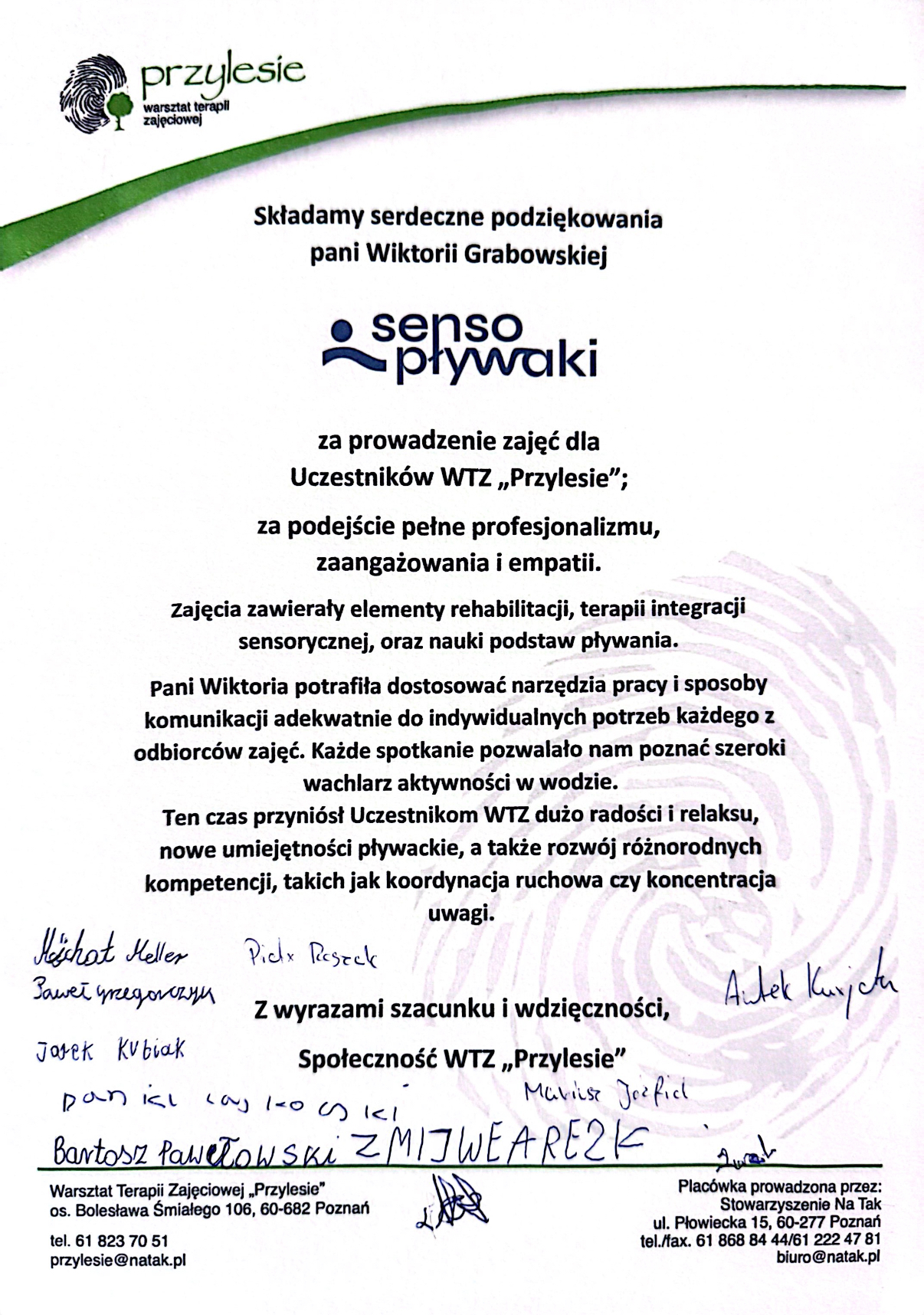 • W 2025 roku ukończyłam studia podyplomowe w dwóch obszarach: psychologii sportu oraz stymulacji zmysłów i integracji sensorycznej. Dodatkowo uczestniczyłam w 200-godzinnych warsztatach terapii zajęciowej w ośrodku 'Przylesie’, przeznaczonych dla osób dorosłych z niepełnosprawnością intelektualną. W ramach zajęć prowadziłam specjalistyczne zajęcia w wodzie, obejmujące elementy rehabilitacji, integracji sensorycznej oraz nauki pływania.
