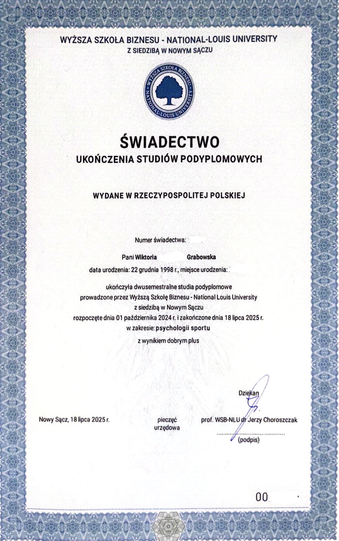 • W 2021 roku ukończyłam studia licencjackie z Psychologii w biznesie w Wyższej Szkole Bankowej w Poznaniu. Podczas studiów otrzymałam stypendium Ministra Nauki i Szkolnictwa Wyższego za znaczące osiągnięcia sportowe i akademickie.